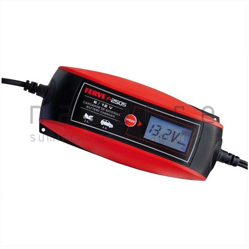 El cargador de baterías F2505 de Ferve es de la última generación de cargadores, con un tamaño súper reducido. Automático y carga baterías de todo tipo, motos, quads, pequeñas embarcaciones, coches, tractores y vareadoras de olivas. Válido para todo tipo de baterías. (líquido, gel y AGM).